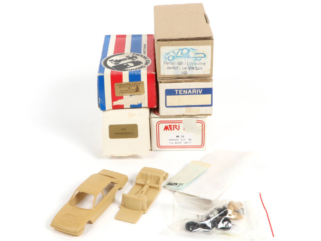 possibilité de petits manques & parties cassées (avec notice) - réalisations en résine, plastique & white métal - on y retrouve notamment les marques : TENARIV, GRAND PRIX MODELS & MOG MODELES - boîtes avec légers frottements, déchirées & accrocs par endroits (état de 'a' à 'c')