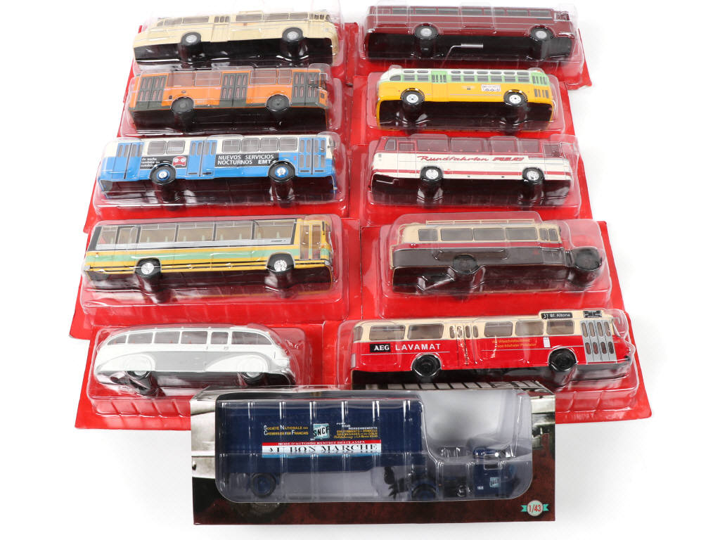 série 'AUTOBUS & AUTOCARS DU MONDE' - comprend notamment les modèles : BÜSSING SENATOR 120 & BERLIET CRUISAIR 3 - sous blisters jamais ouverts - on y joint un semi-remorque FAR - états des boîtes 'a' & 'b'