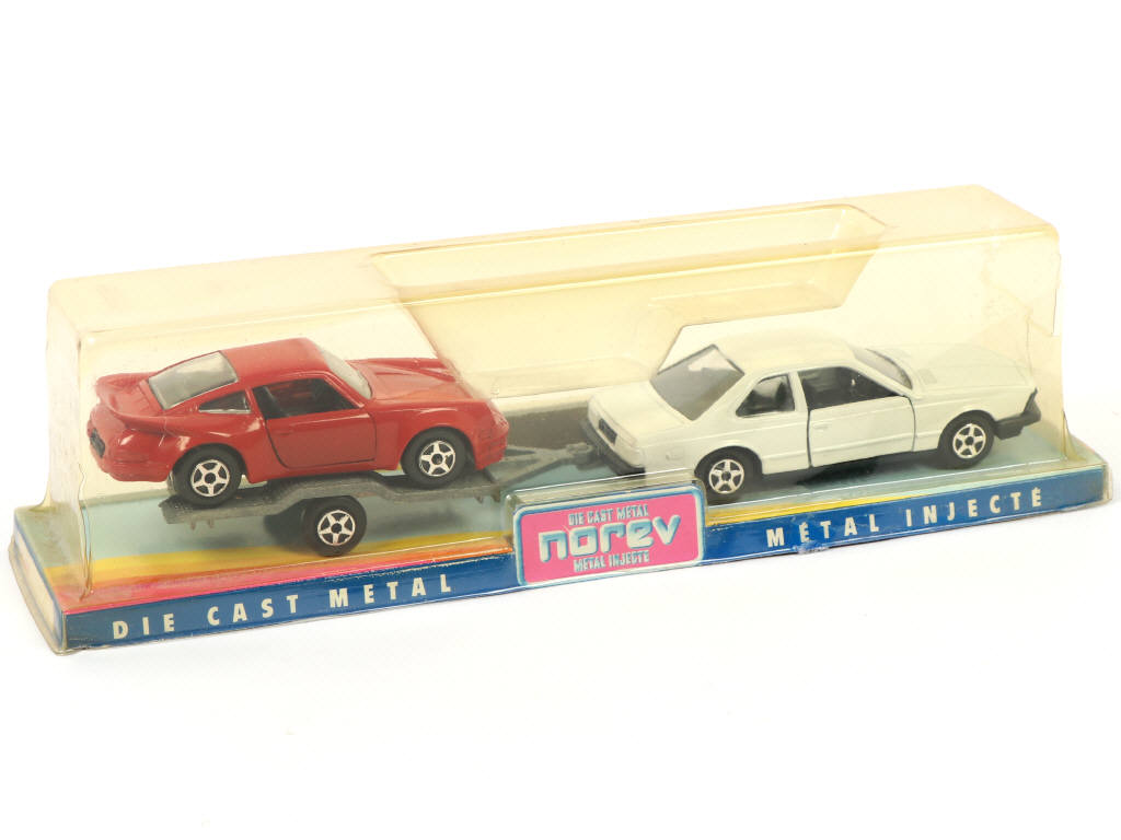 contient : BMW & PORSCHE 911 sur remorque - socle de boite recollé, blister cassé