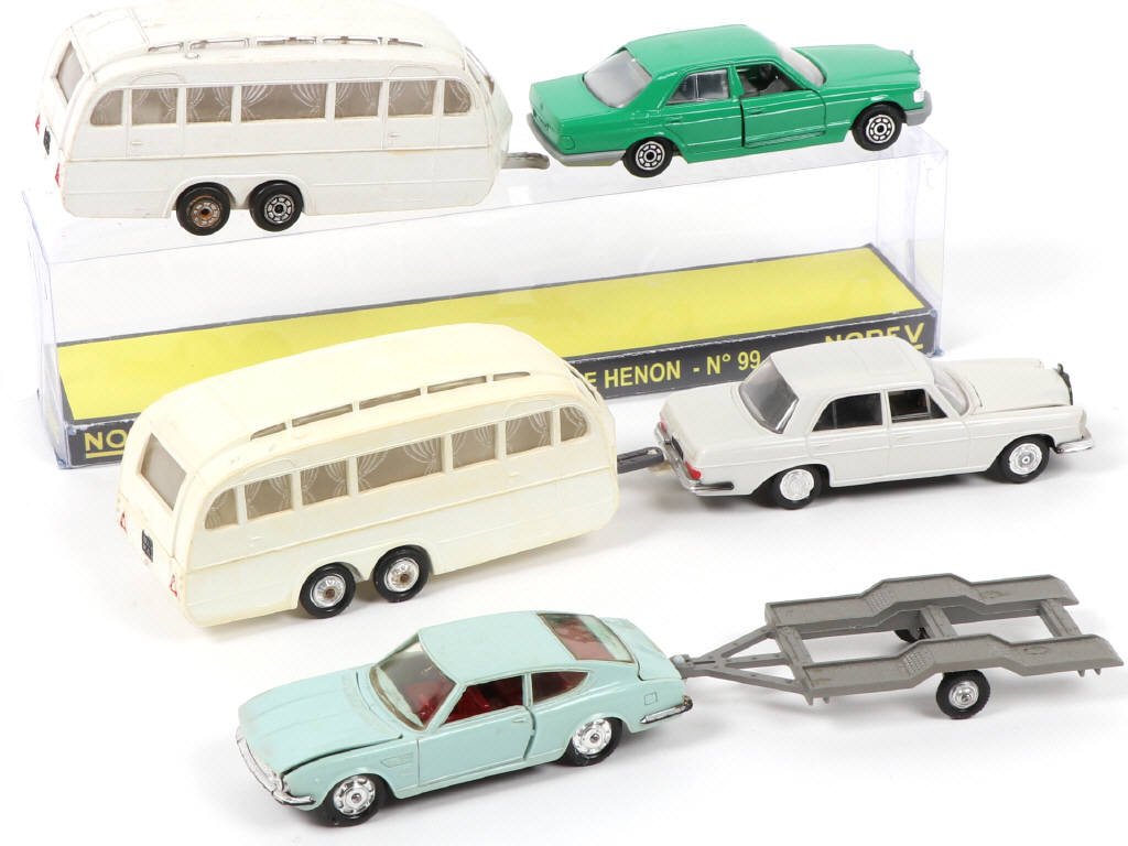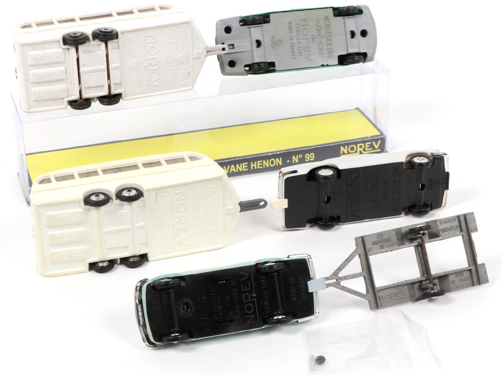 modèles plus ou moins encrassés, parties ternies, traces d'oxydation & petites parties cassées notamment sur la FIAT - série classique & série JETCAR pour la MERCEDES - boite copie