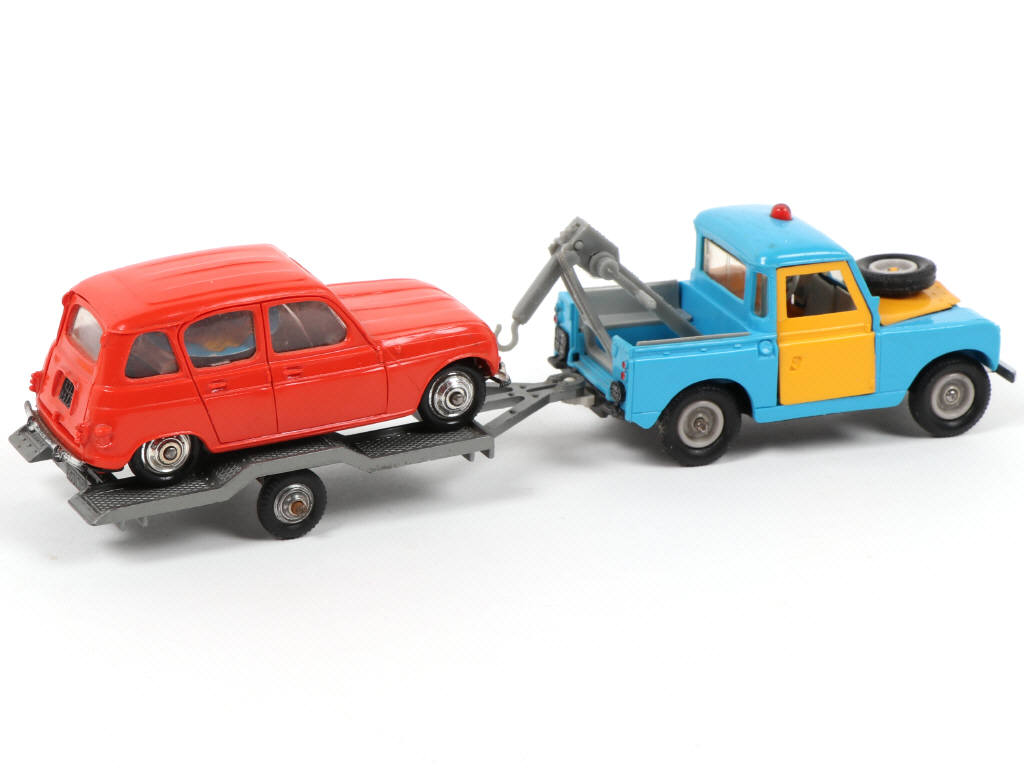 contient : LAND ROVER dépanneuse & RENAULT 4L sur remorque - montage (ou remontage ?) avec ouvrants de couleur différente - un entourage de portière fendu - vitrage de la 4L opacifié - boite copie