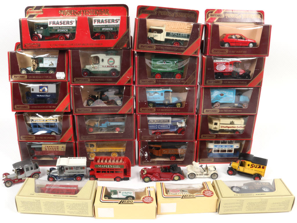 on y retrouve notamment les modèles : RENAULT, FORD & MERCEDES-BENZ - on y retrouve les marques : LLEDO & MATCHBOX MODEL OF YESTERYEAR - avec manques, parties cassées - états des boîtes de 'a' à 'c' - ensemble encrassé - on y joint une RENAULT non d'origine