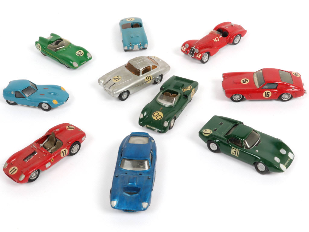 kits en white metal montés & peints (réalisations de qualité inégale) - miniatures reproduisant notamment les modèles : FERRARI & PANHARD - on y retrouve notamment la marque GRAND PRIX MODELS - quelques éléments cassés, à recoller & manquants (suivant les exemplaires)