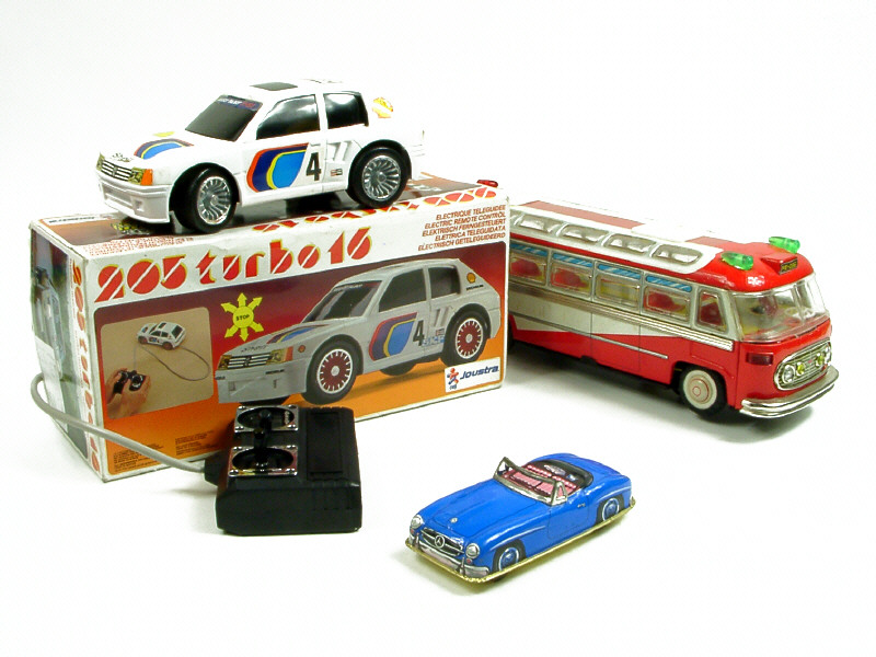 longueur 38 cm - moteur à piles (fonctionne) - en action, le car avance en contournant les obstacles tandis que ses clignotants s'allument à chaque changement de direction - avec bruiteur - petites retouches