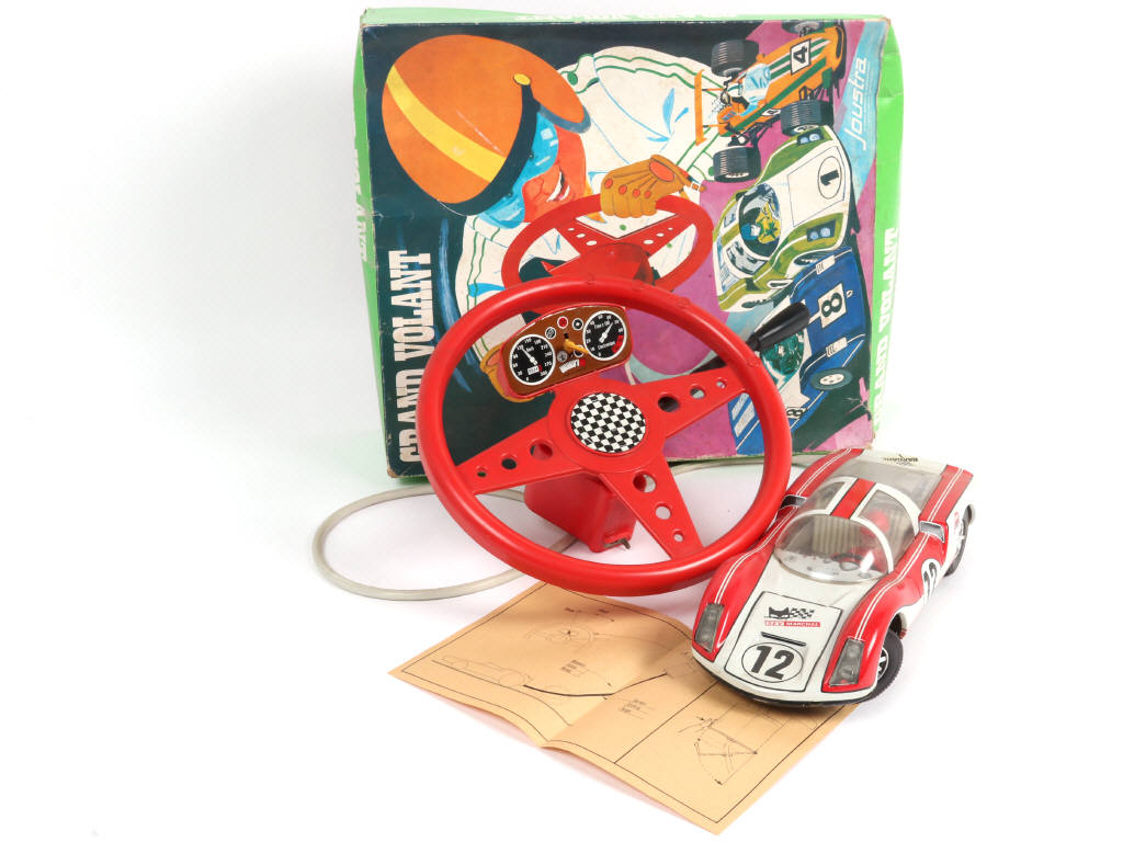 contient une PORSCHE CARRERA téléguidée & un volant de commande (moteur à piles à revoir, petits manques dans le compartiment) - notice & cale de boîte présentes