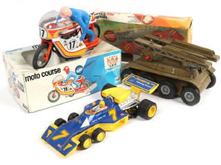 ensemble motorisé (un fonctionnel, la F1) - avec manques & parties cassées sur la moto & le blindé - 2 exemplaires en boîtes (état 'c')
