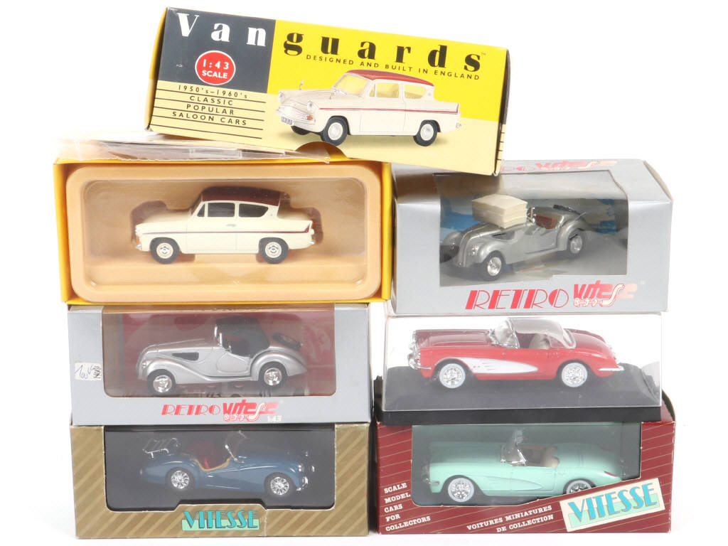 on y retrouve notamment les marques : BMW, TRIUMPH & CHEVROLET - on y joint une FORD ANGLIA de marque LLEDO (avec sachet d'accessoires & documentation) - certaines boîtes légèrement rayées, déformées & avec accrocs par endroits (états 'a' à 'c')