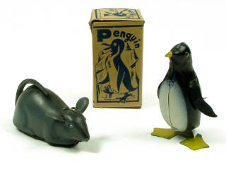 ALPS (JAPON) Pingouin mécanique en tôle peinte noir, blanc & jaune
