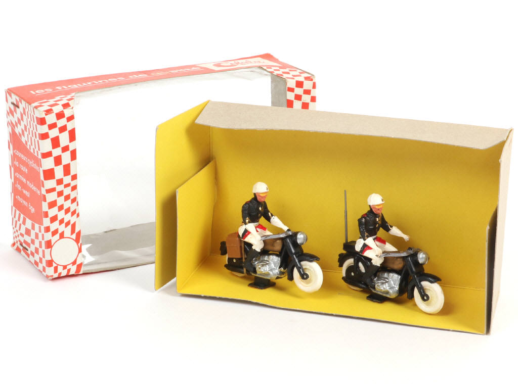 réalisation en plastique - contient 2 motards sur leur moto - ensemble fixé sur socle cartonné - agrafes de boîte oxydées (blister plus ou moins décollé)