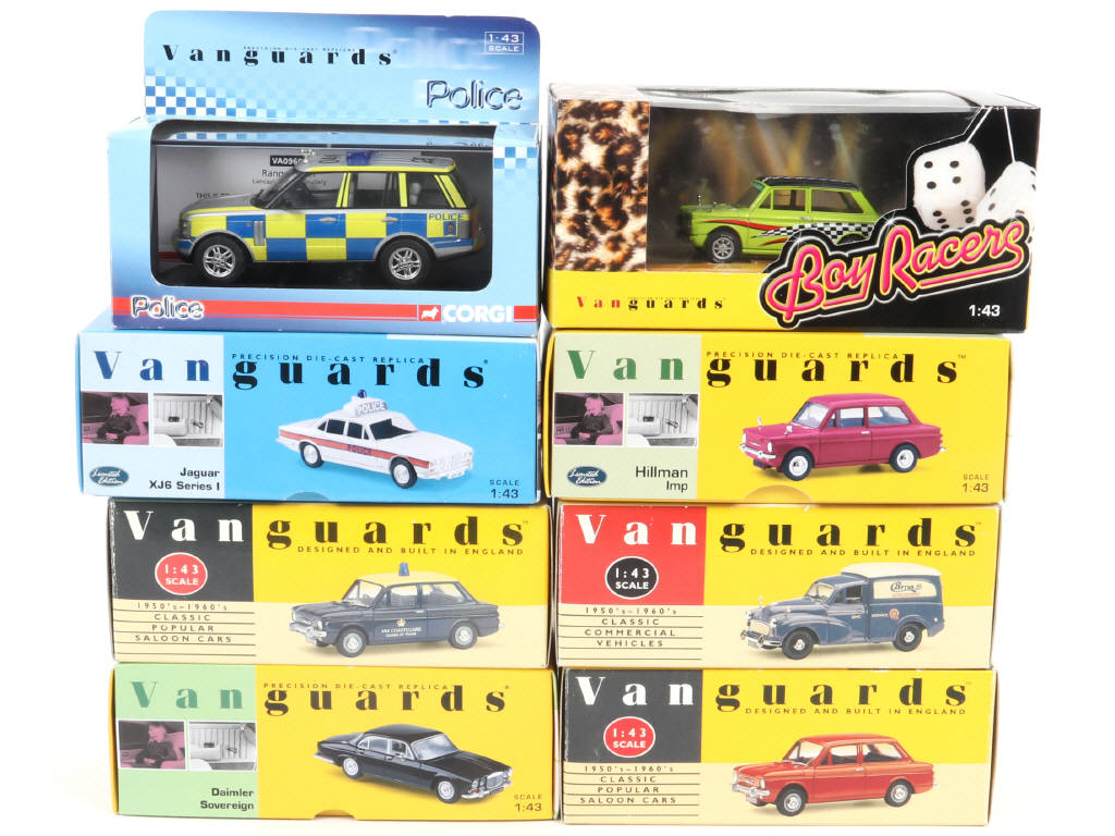 miniatures reproduisant notamment les modèles : JAGUAR, HILMAN & DAIMLER - on y joint un RANGE ROVER de marque CORGI TOYS - certaines boîtes avec légers accrocs par endroits (états 'a' & 'b')