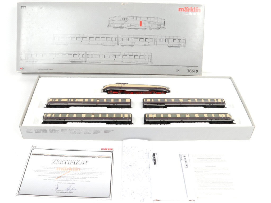 longueur 65 cm - non testé - contient : une motrice diesel type 61001, 4 voitures de voyageurs de 2ème classe, notices, certificat & bon de garantie - boîte avec accrocs & déchirée par endroits