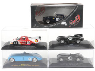 miniatures reproduisant les modèles : JAGUAR, BUGATTI & RONDEAU - on y joint une FERRARI 250 GT de marque BANG - certaines boîtes légèrement rayées & avec accrocs par endroits (états 'a' & 'b')