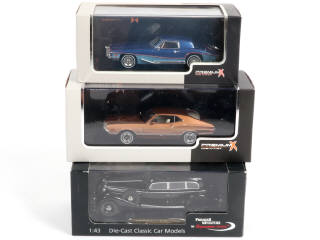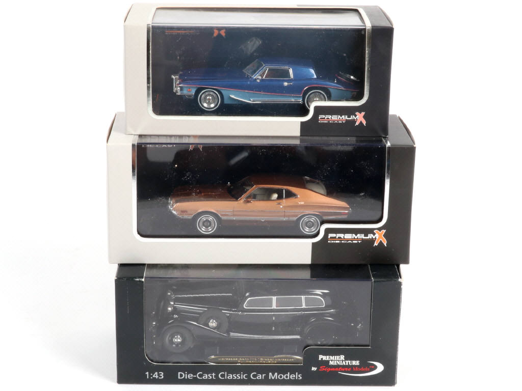 comprend : FORD GRAN TORINO SPORT 1972 & STUTZ BLACKHAWK coupé 1971 - on y joint une MERCEDES 770 de la marque PREMIER MINIATURE