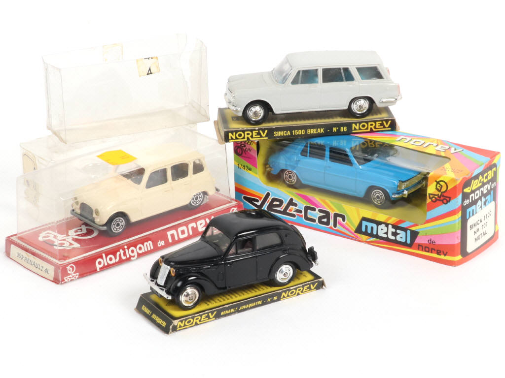 comprend : SIMCA 1500 break, 1100, RENAULT JUVAQUATRE (couleur rare) & 4L - les boîtes sont en états de 'a' à 'c' - un exemplaire de la série 'PLASTIGAM' & un autre 'JET-CAR'