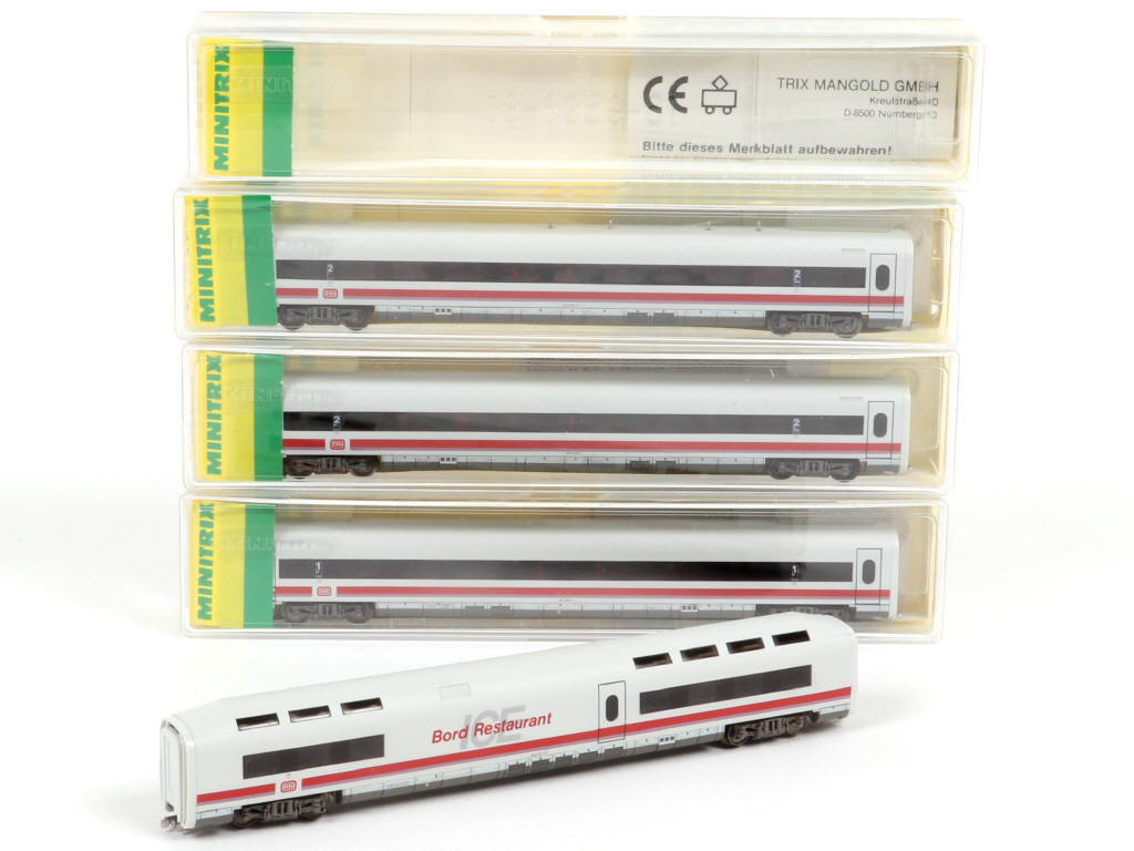 MINITRIX 'N' (ALLEMAGNE) Ensemble de 4 voitures de voyageurs 'ICE' blanc, gris & rouge