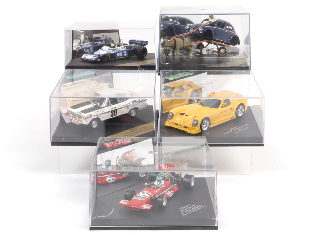 miniatures reproduisant notamment les modèles : TYRREL, OPEL & VW - un exemplaire en édition limitée & 4 avec certificat d'authenticité numéroté - sous boîtes-vitrines (certaines légèrement rayées & fêlées par endroits - états 'a' & 'b')