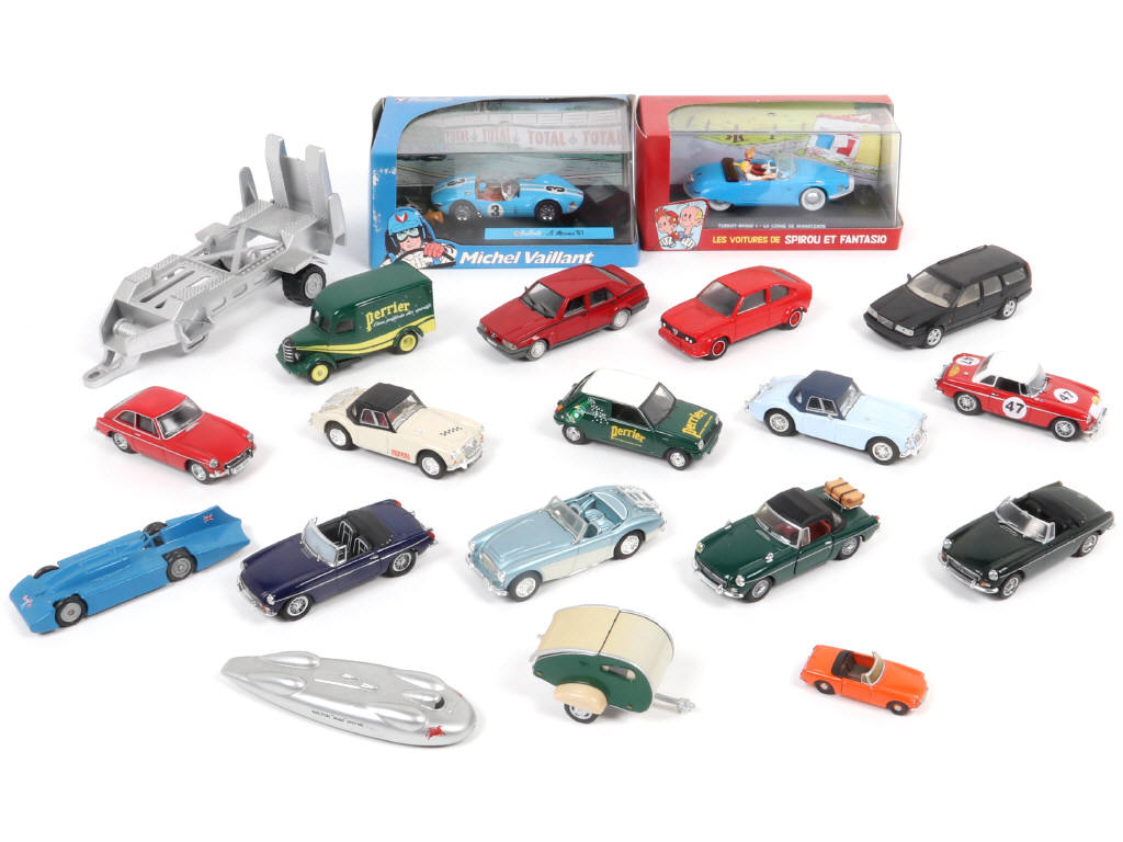 longueur du plus grand exemplaire : 18 cm - on y retrouve notamment les marques : CORGI TOYS, MINICHAMPS & UNIVERSAL HOBBIES - on y joint 2 remorques - avec manques & parties cassées