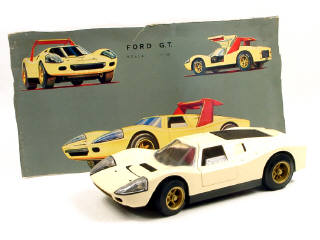 longueur 41 cm - moteur à piles (fonctionne partiellement) - avec phares électriques (une soudure d'ampoule à revoir) - le véhicule ne fonctionne qu'en marche arrière - petits détails de peinture noire ajoutés - manque aileron - on y joint une partie de boîte illustrée
