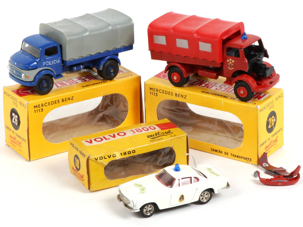 comprend : MERCEDES 1113 pompiers (complètement détruit par le métal fatigue - boite en état 'b'), POLICIA (état 'D.b') & VOLVO 1800 (état 'B.c' - boite déformée)