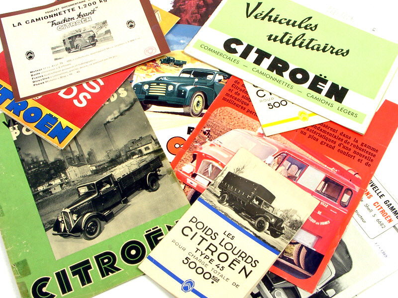 comprend : un exemplaire sur le modèle P 45 de 1936, un exemplaire sur les camionnettes 500 & 800 kg de 1937, un exemplaire sur la gamme utilitaire de 1937, un exemplaire sur la gamme utilitaire d'avant-guerre (en état 'c') & un feuillet sur les véhicules incendie des années 1970 - on y joint un petit fascicule sur le train rouleur 'KEGRESSE', un catalogue sur la 'CROISIERE JAUNE' édité en 1982 pour le cinquantenaire de l'exploit accompagné de ses cartons d'invitation & 3 fac-similé de catalogues de la marque