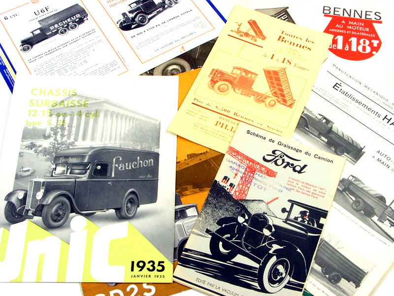 comprend : 3 dépliants sur les modèles PB3, PB3S & PB5 de la marque LATIL, 2 dépliants sur les modèles S25 & CD2S de la marque UNIC (un exemplaire crayonné), un schéma de graissage pour camion FORD, 4 dépliants sur les bennes PILLOT & un dépliant sur les bennes HARDY - on y joint 3 fac-similés sur la marque LATIL, MATHIS & les gazogènes COMETE
