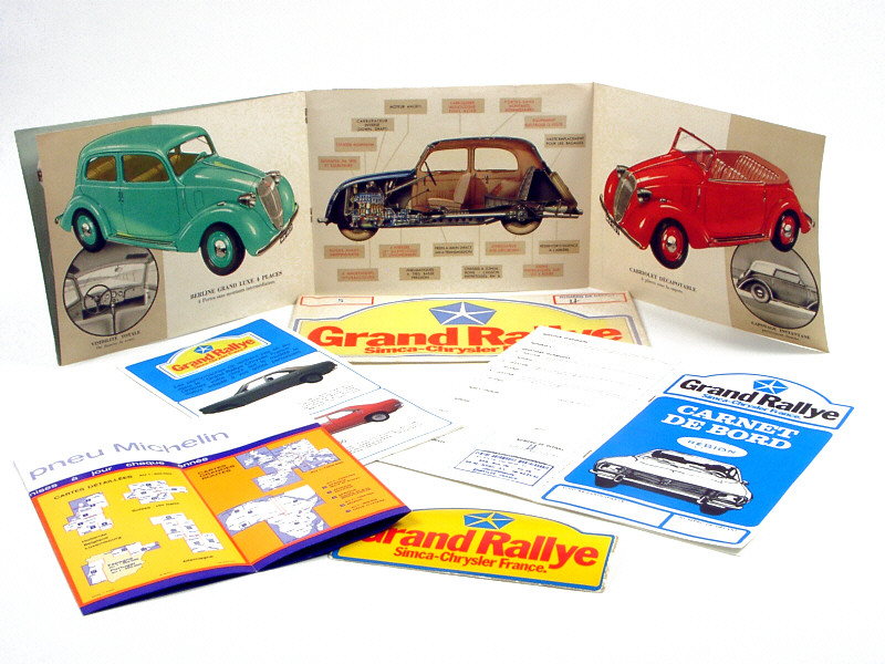 comprend : un exemplaire sur le modèle 8 & une pochette 'GRAND RALLYE' contenant un carnet de bord, un dépliant de la gamme de 1971, un dépliant MICHELIN & un autocollant 'GRAND RALLYE SIMCA-CHRYSLER FRANCE'