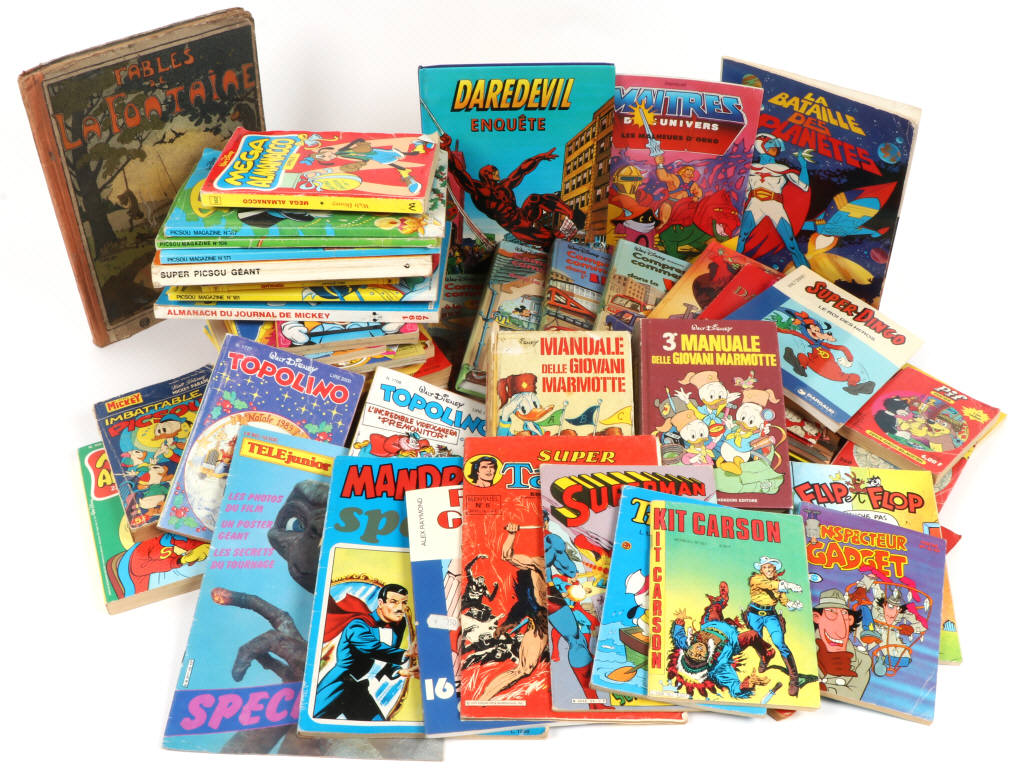 bon état à état général moyen, traces d'usure & de lecture - on y retrouve notamment : DAREDEVIL, LA BATAILLE DES PLANETES, PICSOU (certains en langue italienne), CASTORS JUNIORS, PIF GADGET, SUPER TARZAN & SUPERMAN - on y joint un beau livre 'FABLES DE LA FONTAINE de 1926