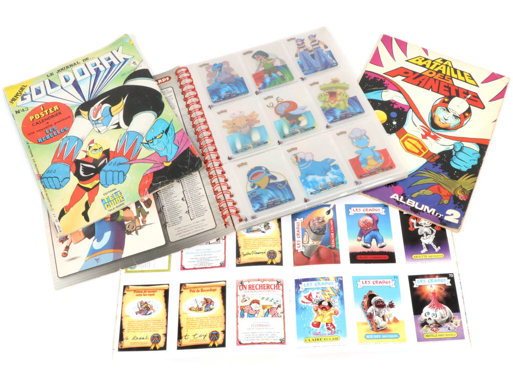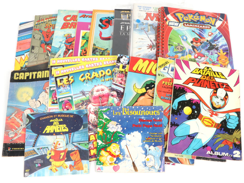 assez bon à très bon état général - années 1970/80 - comprend notamment : comics dont SUPERMAN & CAPTAIN AMERICA, BD STAR WARS, albums CRADOS (avec vignettes non découpées), POKEMON LAMINCARDS (avec 11 cartes), 2 vinyls (BATAILLE DES PLANETES & BISOUNOURS), album PANINI CAPITAINE FLAM incomplet & BD MIGHTOR par TELE JUNIOR - quelques traces d'usure, déchirures & manques possibles