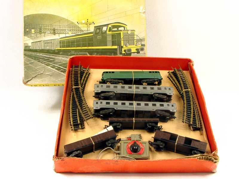 dimensions du coffret : 40 x 37,5 cm - contient : une motrice BB 9240, une voiture de voyageurs de première classe 'LE MISTRAL', une voiture de voyageurs de première classe 'L'AQUILON', un wagon plateau à ridelles basses, un wagon-tombereau, un wagon-fourgon, 8 rails courbes, un transformateur & une notice d'utilisation - contenu & cale de maintien non conformes au coffret - légères traces d'oxydation - avec manques