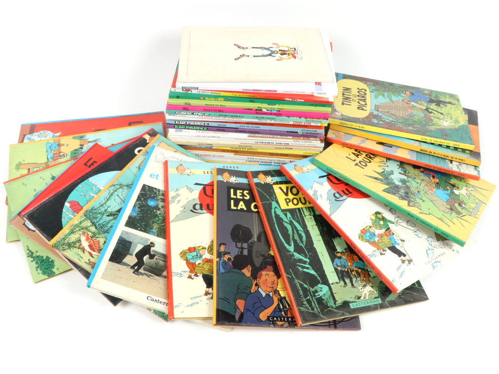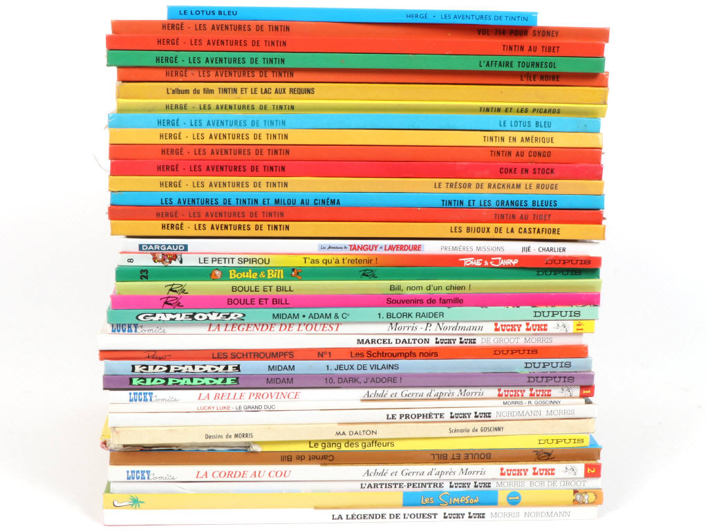 très bon état général - comprend notamment : TINTIN (rééditions années 1970/80), GASTON LAGAFFE (dont un très abimé), SPIROU, KID PADDLE, GAME OVER & LUCKY LUKE - ensemble encrassé, défauts possibles