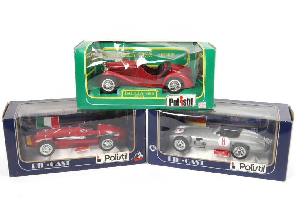 échelle 1/16ème - on y retrouve les modèles : MERCEDES BENZ, FIAT BALILLA 508 (blister craquelé & déformé) & MASERATI 250 F