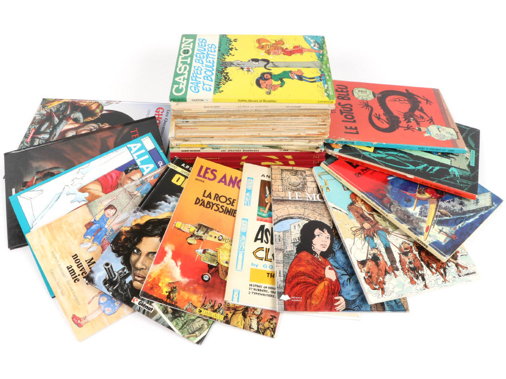 une majorité en très bon état général (sauf les brochés & quelques albums en état moyen voire mauvais) - EO & rééditions - on y retrouve notamment les titres : TINTIN, GASTON LAGAFFE, LUCKY LUKE (brochés) & BLAKE ET MORTIMER