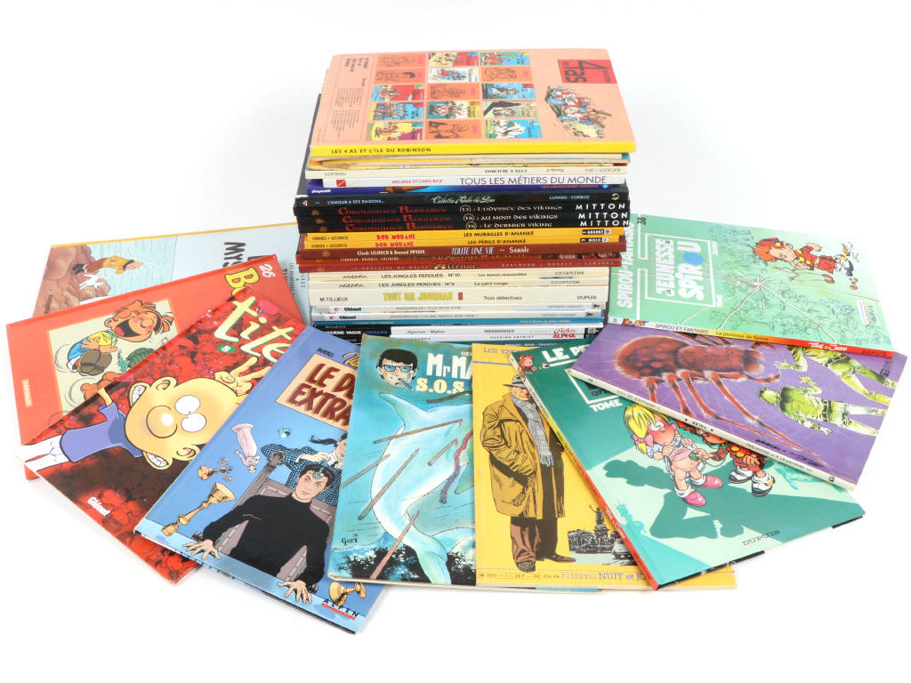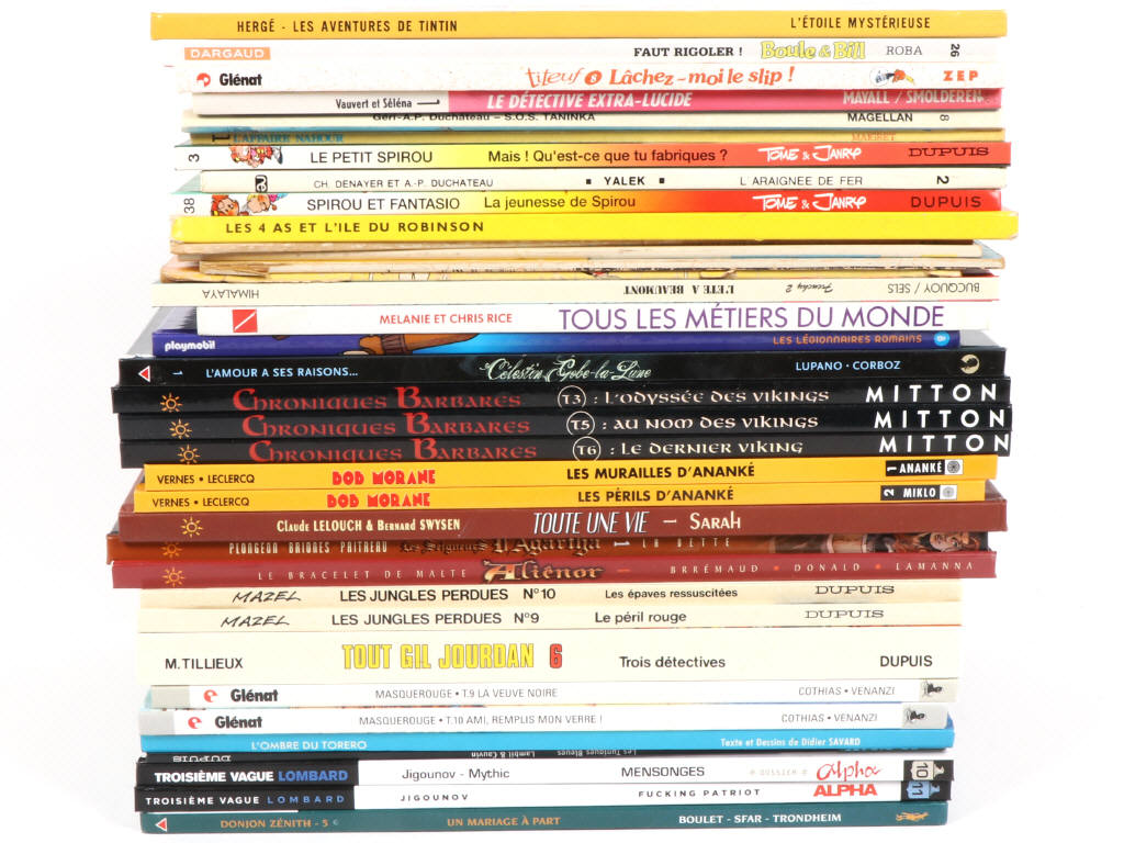 une majorité en très bon état général (sauf les brochés en état moyen) - EO & rééditions - on y retrouve notamment les titres : SPIROU, TITEUF, TINTIN, GIL JOURDAN & BOULE & BILL