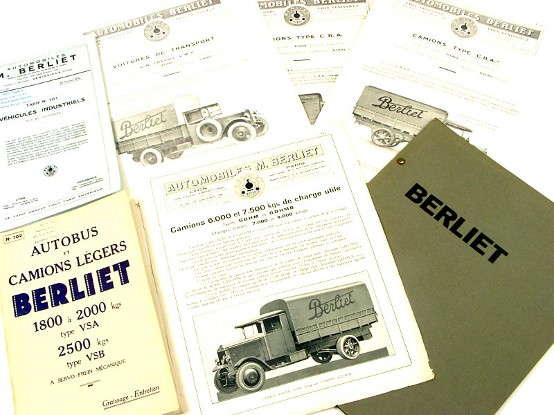 comprend : un exemplaire technique avec plan d'un châssis de type VSBG sur les modèles fonctionnant au bois vert de 1932, un guide d'entretien sur les modèles VSA & VSB de 1932, un tarif des véhicules industriels de 1932, une affichette sur les modèles C.B.A. de 1925, une affichette sur les modèles C.B.A./9 de 1925, une affichette sur les modèles V.M.P. de 1925 & une affichette sur les modèles GDHM & GDHMB de 1925