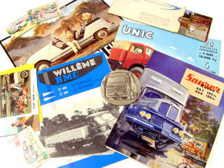 comprend : un catalogue SAURER sur les modèles ZS 7 & ZS 9 de 1967, un catalogue WILLEME sur les modèles C 60 & C 80, un catalogue WILLEME sur la gamme B.M.C., une affichette sur la RENAULT 4L PLEIN AIR, 2 petits dépliants sur la gamme de modèles automobiles FIAT, une série de 12 cartes postales SIMCA sur les différents modèles de la gamme du début des années 1960, une série de 6 images SIMCA & un petit catalogue SIMCA sur les différents modèles d'ARONDE - on y joint un fac-similé de catalogue publicitaire UNIC & une médaille BERLIET représentant le modèle TR 350 du salon de 1978