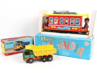 un maintien de benne cassé, traces d'oxydation & encrassé - boite incomplète - on y joint un tramway en tôle JYESA en état 'A.c' (non testé)