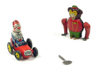 longueur 12 cm - moteur à clef (fonctionne partiellement) - avec clef - en action, la voiture tourne en rond tandis que le personnage oscille d'avant en arrière & fait se cabrer l'avant du véhicule par son poids