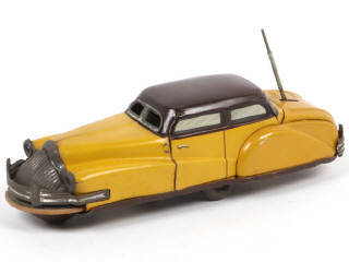 longueur : 16 cm - moteur à clef (fonctionne) - en action, la voiture se détourne des obstacles rencontrés & un mécanisme l'empêche de tomber lorsqu'elle arrive au bord de sa surface de roulement - parties chromées ternies
