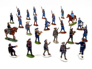 comprend : 6 soldats fusil à l'épaule, 2 tambours, 2 clairons, un porte-étendard & un officier sabre à l'épaule - on y joint un soldat à cheval vraisemblablement de marque ALUDO