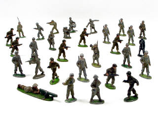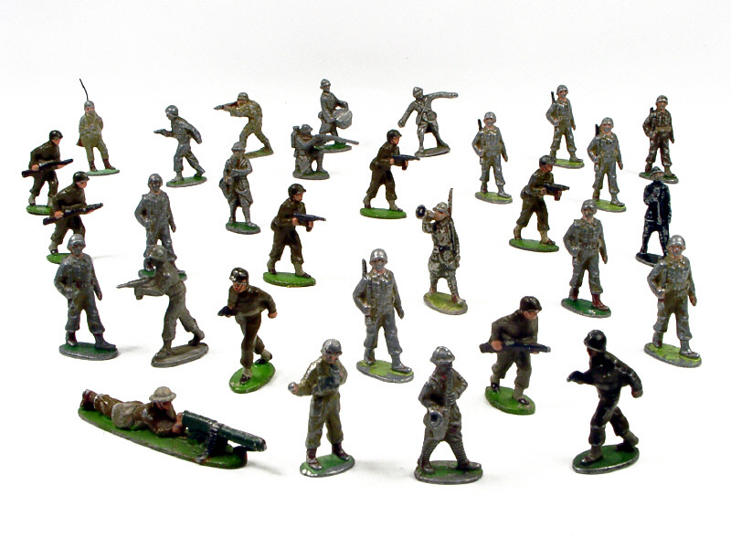 états de 'A-' à 'E' - comprend : 9 fantassins 'Rhin & Danube', 10 soldats américains au combat, un parachutiste, un soldat anglais avec mitrailleuse, un parachutiste avec radio, un parachutiste porte-antenne & 7 soldats de l'infanterie française dont un porte-drapeau, un tireur à genou, un tambour, un clairon, un lanceur de grenade & 2 saxophones - manque le drapeau & 8 fusils cassés