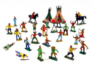 comprend : 12 cow-boys dont un cavalier, 12 indiens dont un cavalier, un tipi double & un feu de camp - quelques petits manques