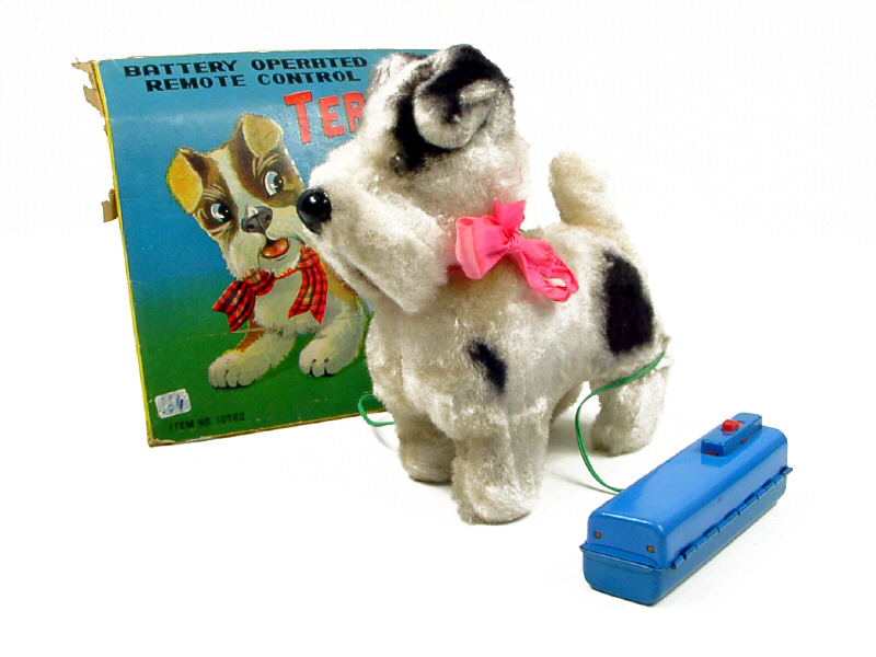 longueur 18 cm - moteur à piles (fonctionne) - téléguidé - en action, le chien avance en remuant la queue tandis que ses yeux s'éclairent - puis il s'arrête, s'assoit & aboie - une ampoule à revoir - avec couvercle de boîte en état 'e'