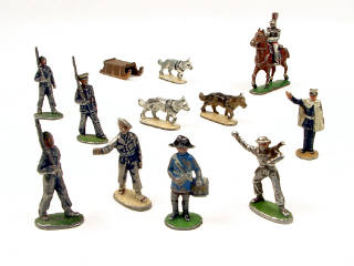 comprend : 2 chasseurs au défilé, un agent de police, un aviateur au défilé, un chasseur alpin porte-étendard (manque drapeau), un soldat britannique, un garde républicain sur son cheval & un agent de police (manque son bâton)