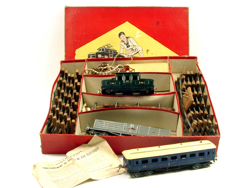 contient : une motrice électrique type 'PO', une voiture voyageurs première classe, un wagon-tombereau avec portes ouvrantes, un wagon-plateau à ranchers avec chargement, un transformateur avec ampoule, 12 rails courbes & notice - petites traces d'oxydation sur les rails