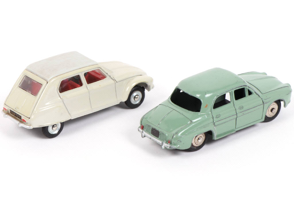 comprend : CITROËN DYANE (carrosserie légèrement jaunie, micro-fêlure sur un montant de toit, avec 2 bagages) & RENAULT DAUPHINE (frottements, légères traces d'oxydation sur les jantes)