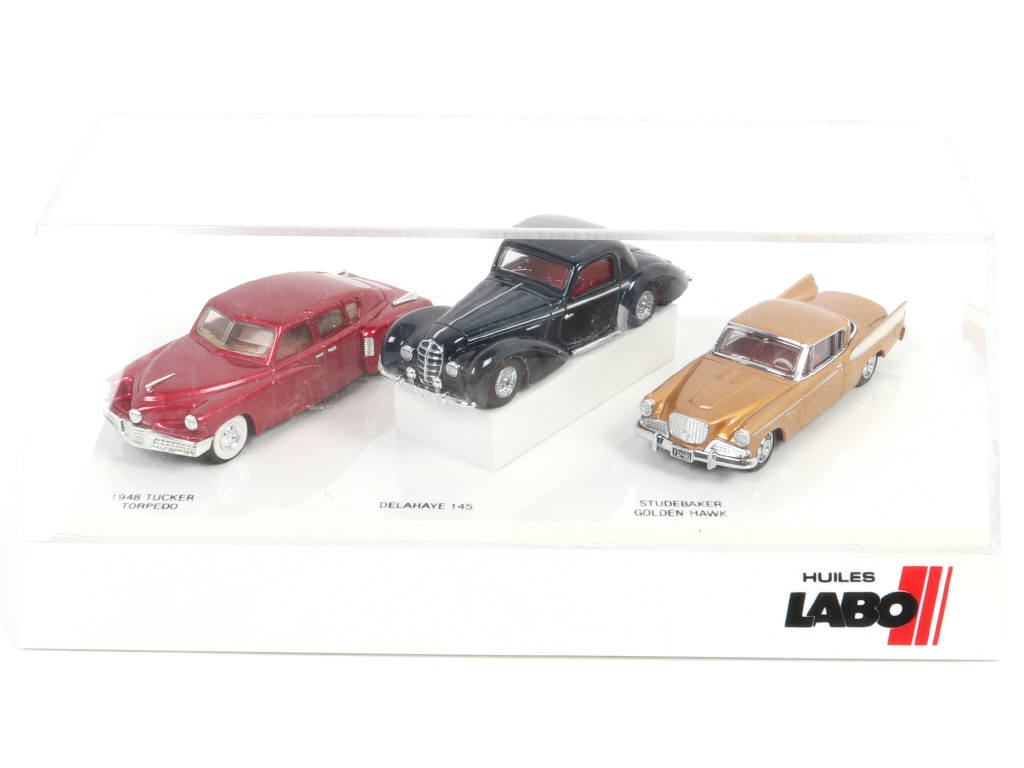 sous boîte vitrine 'HUILES LABO' - comprend les modèles TUCKER, DELAHAYE & STUDEBAKER
