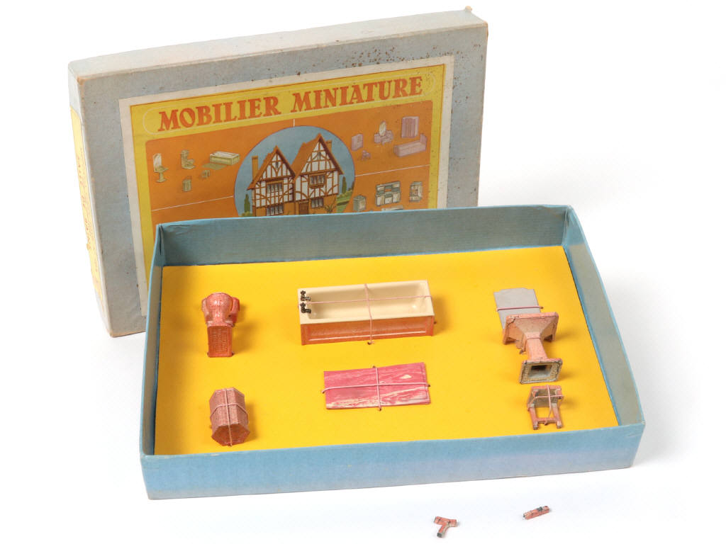 série 'MOBILIER MINIATURE' - fabrication de 1936 - plus ou moins décoloré & taché par endroits (avec plaquette de présentation & ficelles de maintien d'origine) - comprend : baignoire (état 'A'), tapis en caoutchouc (état 'A', toujours souple), lavabo avec miroir (état 'D'), panier à linge (état 'A-', complet), WC (état 'C', rabat de cuvette présent, traces de métal fatigue) & tabouret (état 'D', traces de métal fatigue avec cassures)