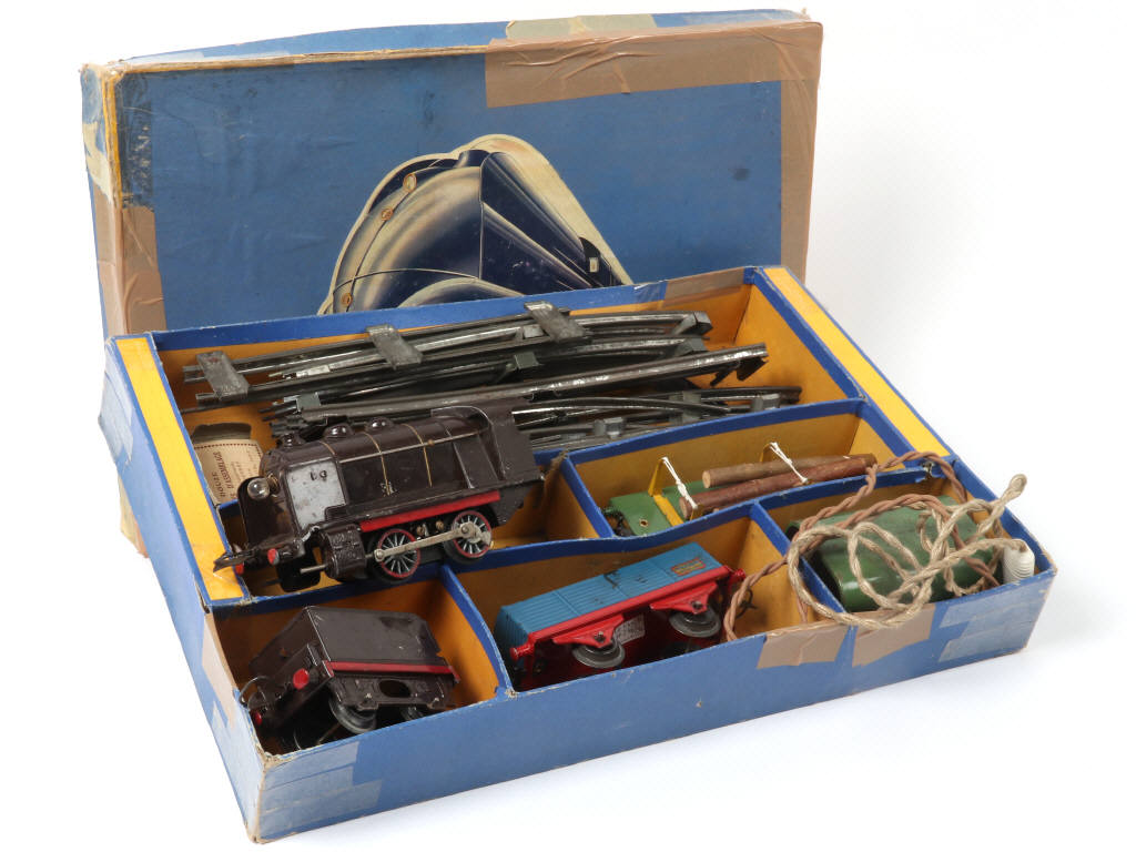 contient : une locomotive à vapeur type 020 avec tender (non testée), 2 wagons, un transformateur, différents rails & broches d'assemblage - quelques manques & parties ternies