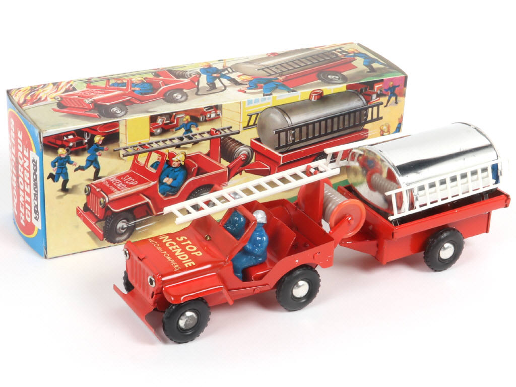 JOYAX (FRANCE) JEEP de pompiers avec remorque-citerne en tôle rouge