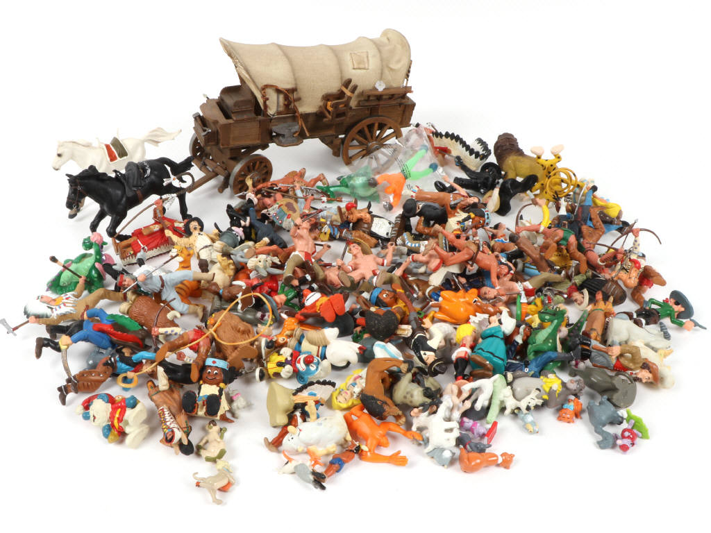 petite taille - on y retrouve principalement les marques : BULLYLAND, SCHLEICH & PLASTOY - comprend notamment les thèmes : SCHTROUMPFS, DISNEY & FAR WEST - un y joint un chariot en bois (possibilité de manques & parties cassées)